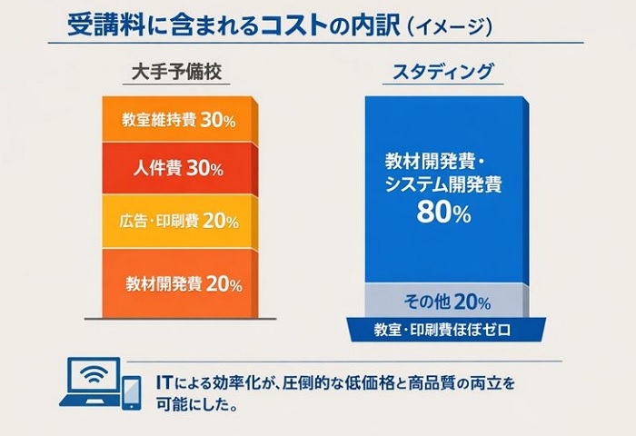 「安すぎて不安だ」「教材の質が低いのではないか」という疑念を抱くのは当然です。しかし、スタディングと大手予備校(TACや大原など)は、ビジネスモデルそのものが根本的に異なります。 スタディングの低価格は、質の低下ではなく、徹底した「コスト構造の破壊」によって実現されています。